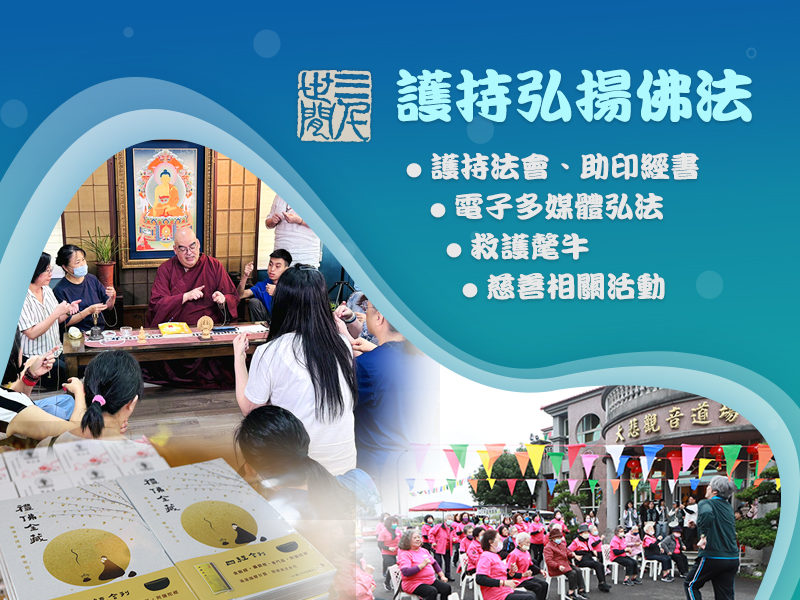護持會務:弘法、培育僧才、僧伽安養、醫療及生活救助、宣揚佛教教義與經典印製、佛教刊物影片及電子多媒體弘法、設置傳教場所等之佛教弘法慈善護生相關活動。